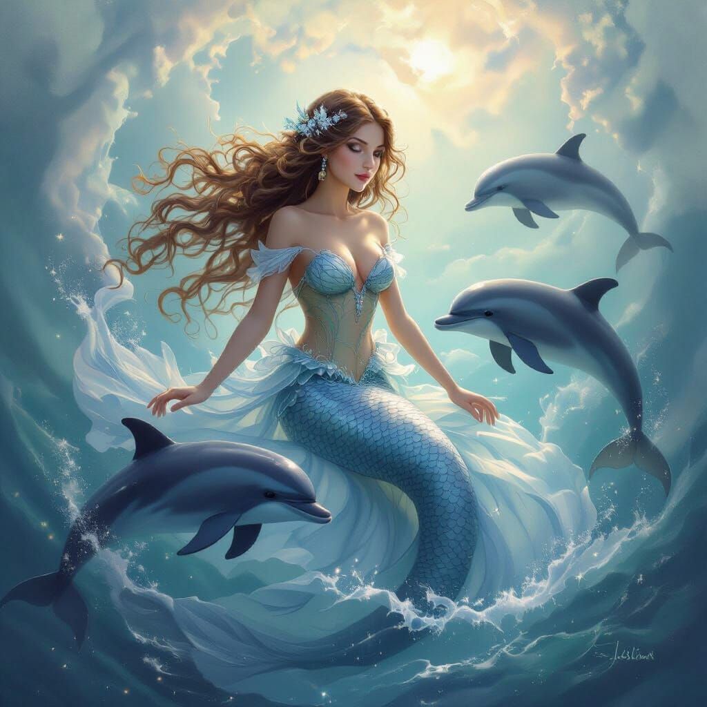 A captivating image of a mermaid with dolphins in a misty ocean, reminiscent of dreamy fantasy art. The artwork features luminous details and soft, ethereal textures.