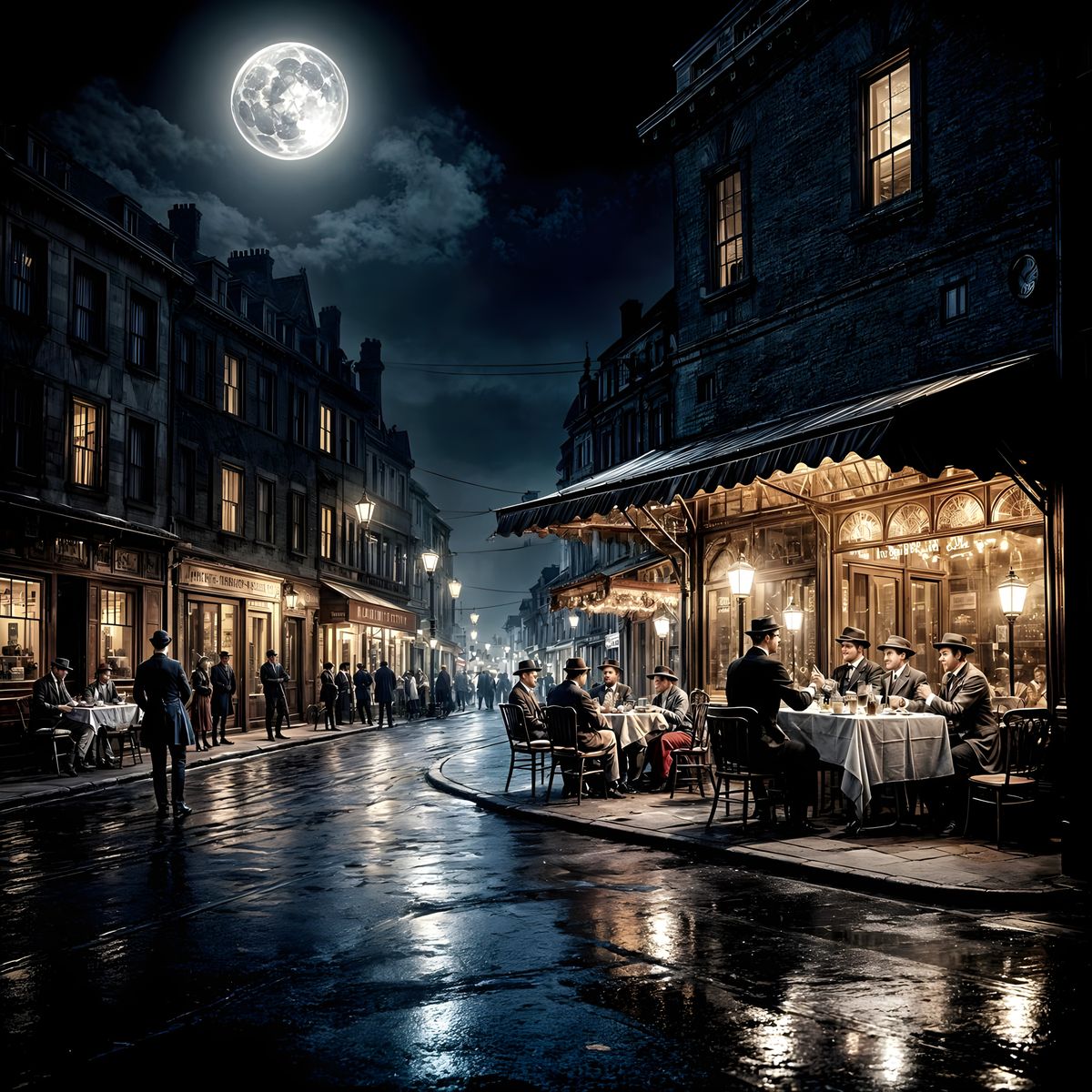 A surreal double exposure captures a happy night out. Friends laugh at an almost empty outdoor dining scene on a quiet 1900s street with one car.