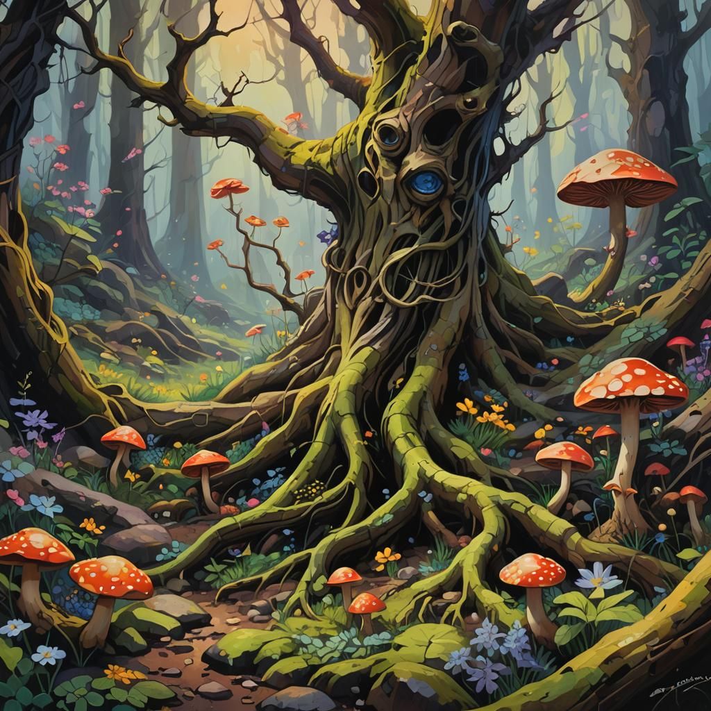 A striking picture of a spring fairy in a dark, misty forest. The fairy is surrounded by tree roots and wildflowers, with golden light filtering through the mist in a fauvist style.