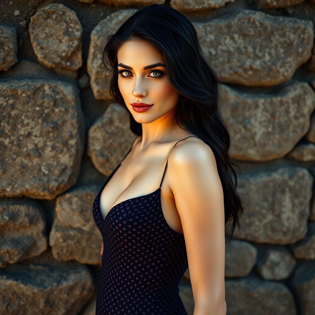 This image shows a stunning woman posing against an ancient stone wall, her elegant attire and delicate features accentuated by soft, golden lighting. The intricate patterns on her gown and the rough texture of the wall create a striking contrast, highlighting her refined beauty.