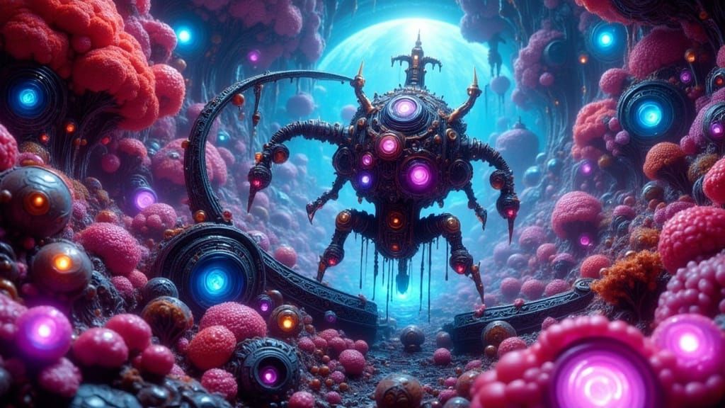 This image shows a cute nanobot in a neon sci-fi environment. The image has morbid undertones with a rococo-inspired ink-wash art style and a hypermaximalist aesthetic. The composition is fragmented and abstract.