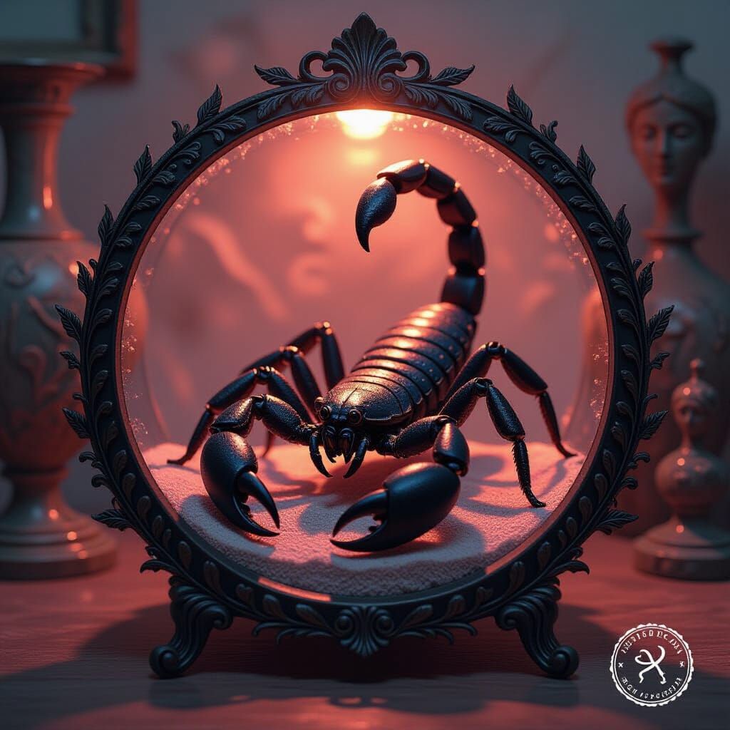 A captivating image of a realistic black scorpion inside an ornate glass terrarium. The terrarium features a metal frame with carved leaves and vines, set in a dimly lit room with soft pink and peach lighting.