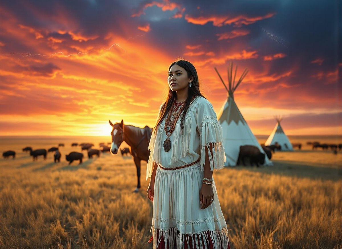 This image shows a young Lakota woman in traditional dress standing in a village as the sun sets. The dramatic sky and soft lighting create a sense of mystical power and peaceful contemplation.