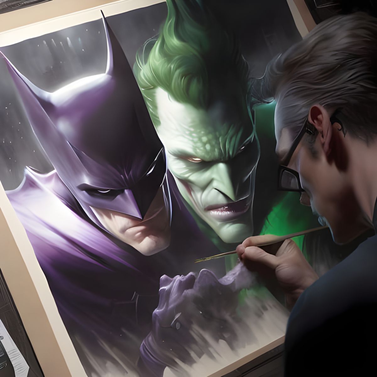 A detailed matte painting of Batman in deep color. The image features fantastical, intricate details with complementary colors and is rendered as fantasy concept art in 8k resolution.