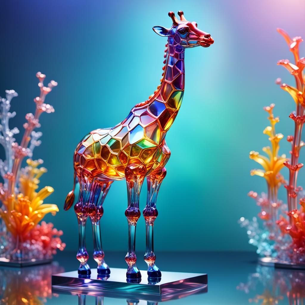 A striking picture of a crystal giraffe figurine on a plinth. The glass sculpture exhibits a play of light and color, creating depth and dimension as 3D rendered digital art.