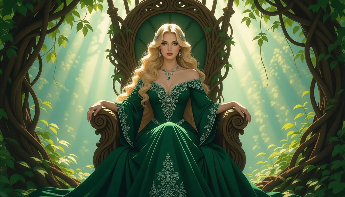 This image shows a majestic woman with flowing blond hair, wearing an emerald gown with silver embroidery, seated on a vine throne. Sunlight filters through lush foliage in an art nouveau style.