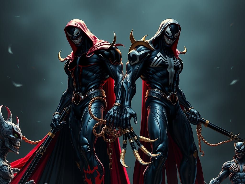 This image shows two iconic comic book characters, Spawn and Venom, depicted in a dark and sinister hyperrealistic style with perfect HDR quality, reminiscent of comic book art by renowned artists.