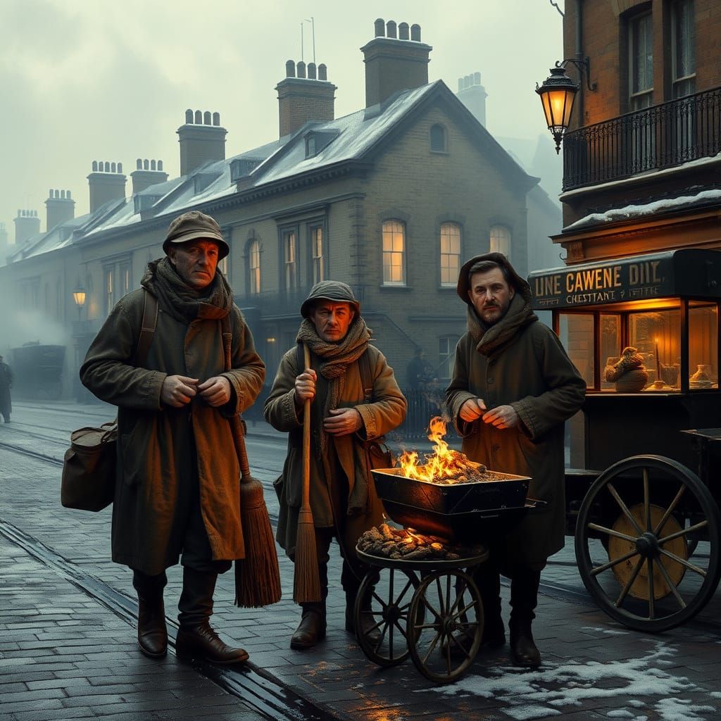 This image shows a group of chimney sweeps near a chestnut cart on icy cobblestones in a London street. The picture captures the atmosphere of Victorian London with detailed oil painting textures and dramatic light in a muted color palette.
