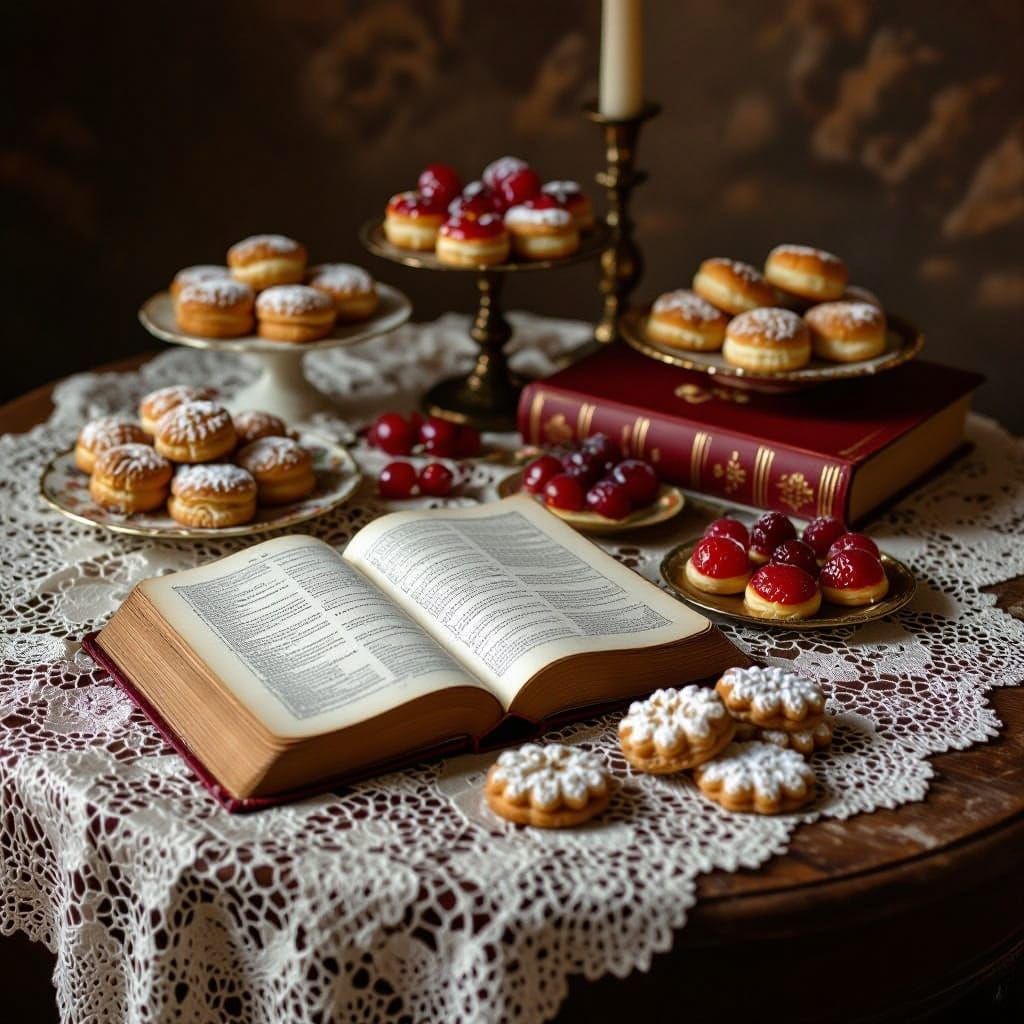 A serene still life of a lace-covered table, adorned with a crimson prayer book, pastries, and candied fruits, bathed in warm, golden light, evoking a sense of timeless devotion and rustic charm.