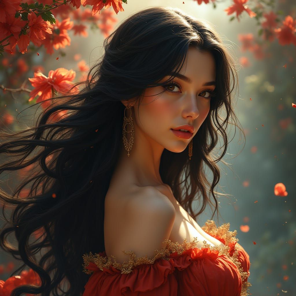 A hyper-realistic 8K image of a medieval woman with long, dark hair, featuring intricate details and dramatic lighting, inspired by classic fantasy art styles.