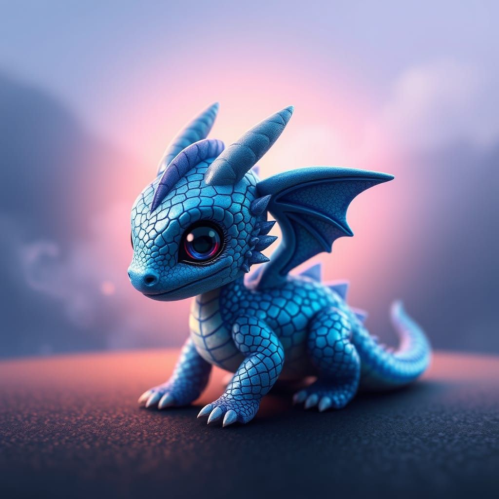 This enchanting image features a small, adorable blue dragon with shimmering scales in soft blues and purples, surrounded by a halo of ethereal light and set against a muted gradient background. The dragon's scaly texture and intricate patterns evoke a sense of fantasy and wonder, with a warm and invitin...