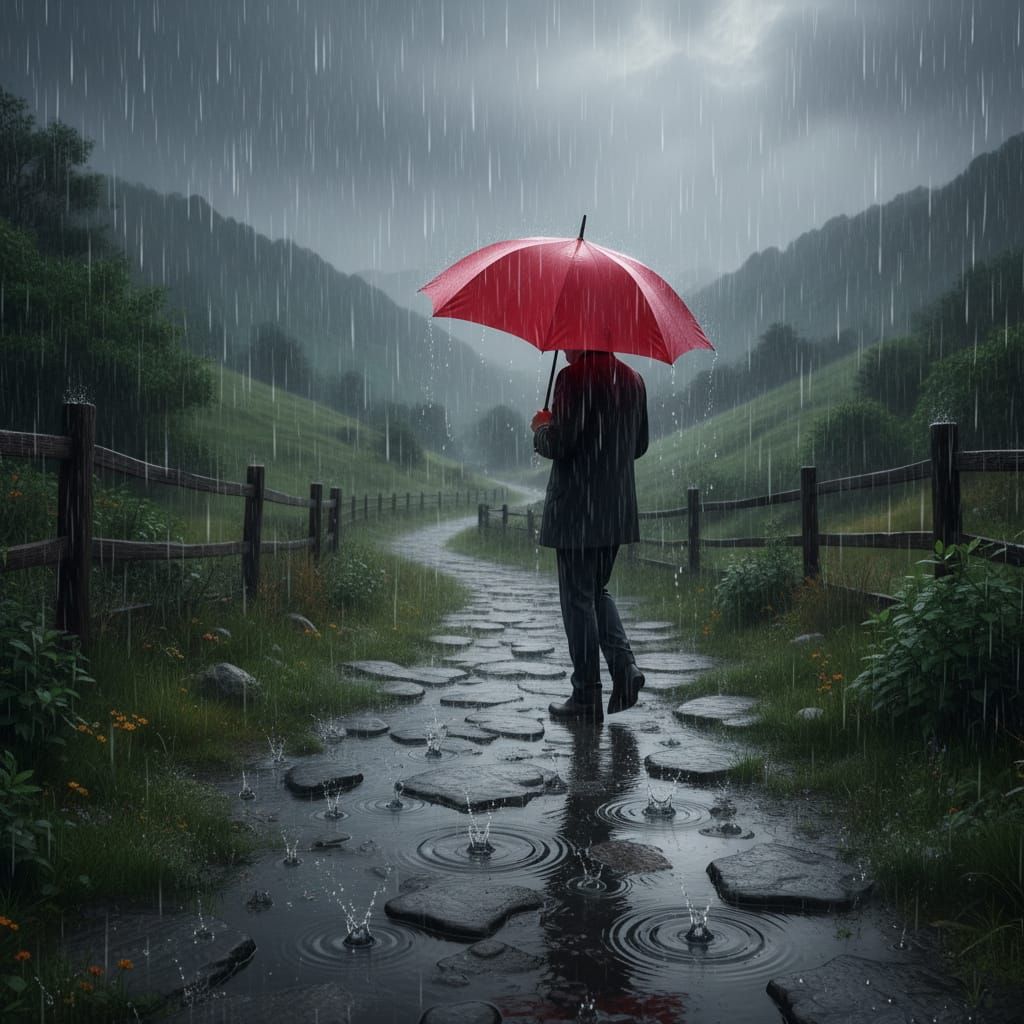 This image depicts a person with a red umbrella walking on a wet stone path during a downpour. The scene emphasizes the intense rain, puddles, and a dramatic, immersive atmosphere.