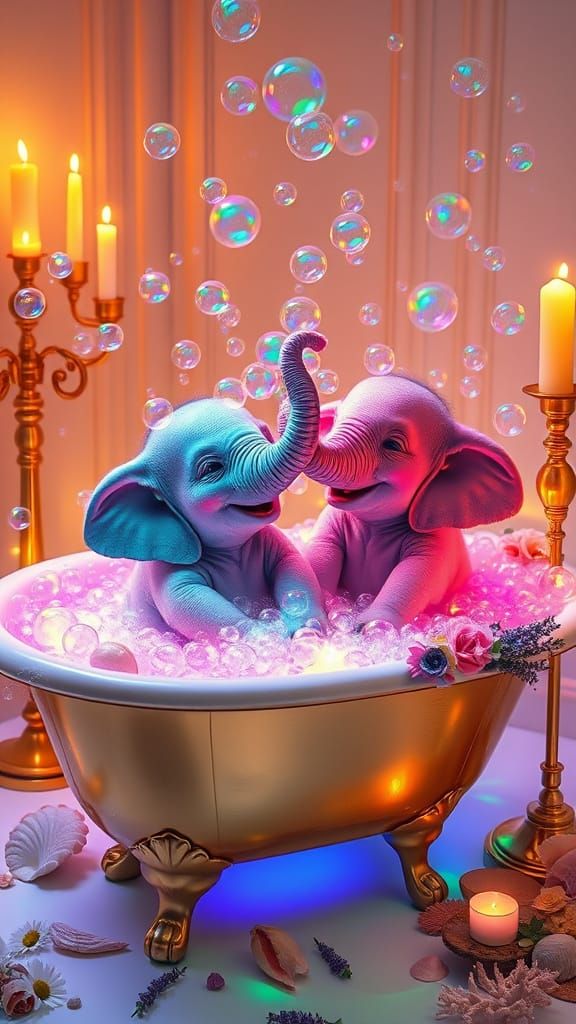 Acrylic Watercolor of (baby elephants covered in bubbles) taking a candlelit bubble bath, laughing & playing in a (gold claw footed bathtub) overflowing with luminous iridescent rainbow colored bubbles. (Table beside) contains (many different sized lit candles) in (gold candlesticks), (daisies, Lavender, ...