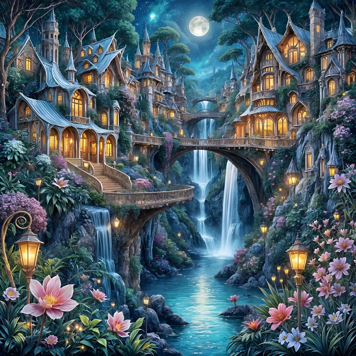 This image showcases a fantastical garden city inspired by Antoni Gaudí, featuring bioluminescent flora and crystal structures. It blends organic architecture with Art Nouveau elements and glowing waterfalls for a serene, magical atmosphere.