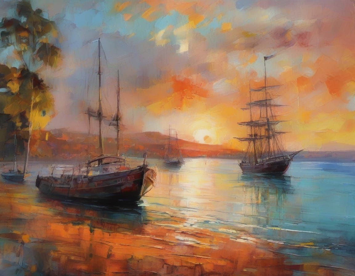 This stunning image depicts a majestic Sydney harbour in 1858, with sailing ships and colonial architecture, in a vibrant post-impressionist style with thick, textured brushstrokes and intricate details reflecting off the rippling water.