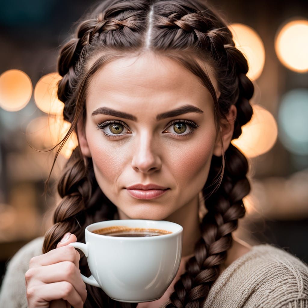 A close-up portrait of a woman with long brown hair and sparkling dark eyes, gazing seductively as she holds a steaming cup of coffee in a fine art photography style with earthy tones and rich textures.