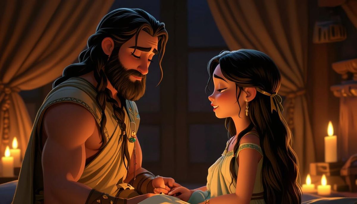This image shows a suspenseful scene of Delilah cutting Samson's hair in a Pixar-style children's illustration. The dim lighting and rich shadows enhance the drama.