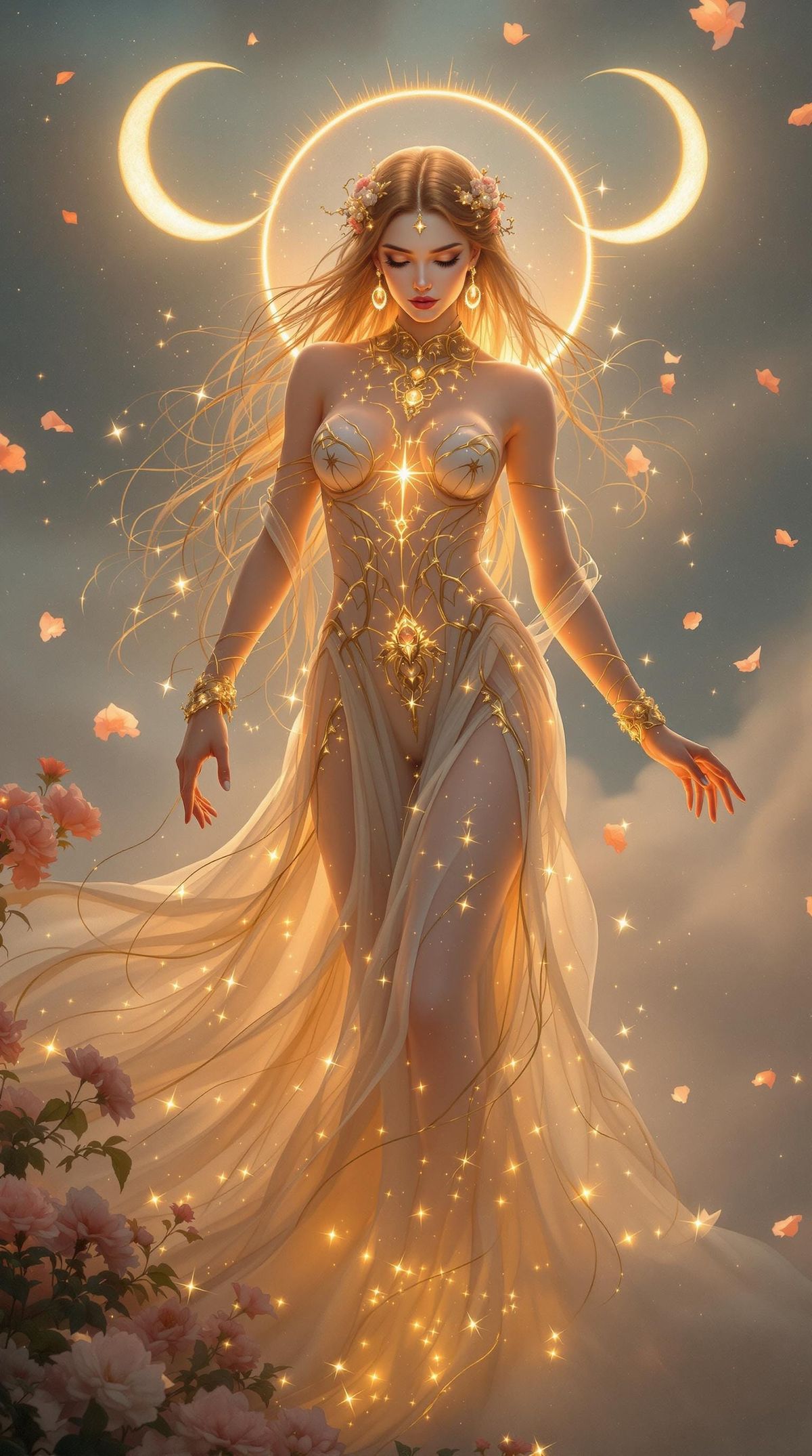 Now, cloaked in light and bloom, she walks again—barefoot on clouds that never end, her voice a song that could awaken comets. And as the universe crumbles under its own cold weight, she extends a single rose, sharp with thorns, and speaks: