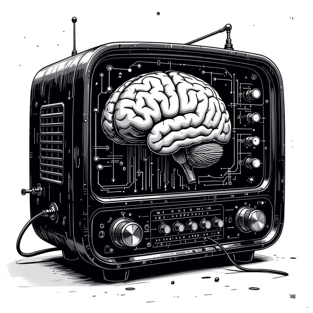 A striking picture of a vintage radio containing a human brain. The black and white sketch features intricate details, smooth outlines, and a lattice-like structure against a stark white background.