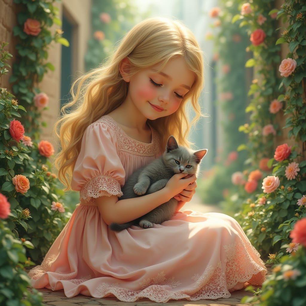 A delicate watercolor painting of a young girl in a lush garden setting, cradling a pale grey kitten in her arms, surrounded by vibrant greenery and colorful blooms, with intricate lace and floral patterns on her pale pink dress, evoking a sense of whimsy and innocence
