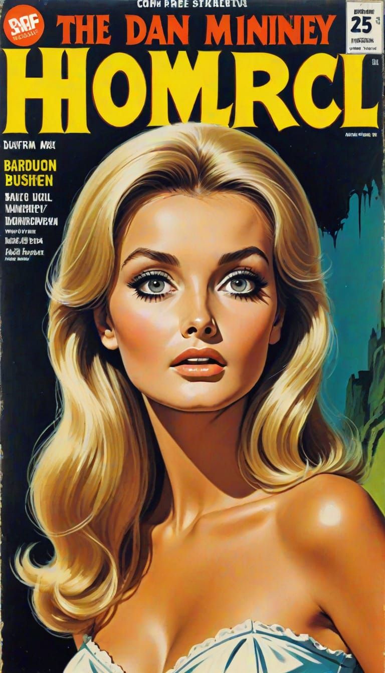 This illustration depicts a beautiful, fresh-faced blonde actress as a damsel in distress on a vintage 1960s horror magazine cover, rendered in a comic book art style.