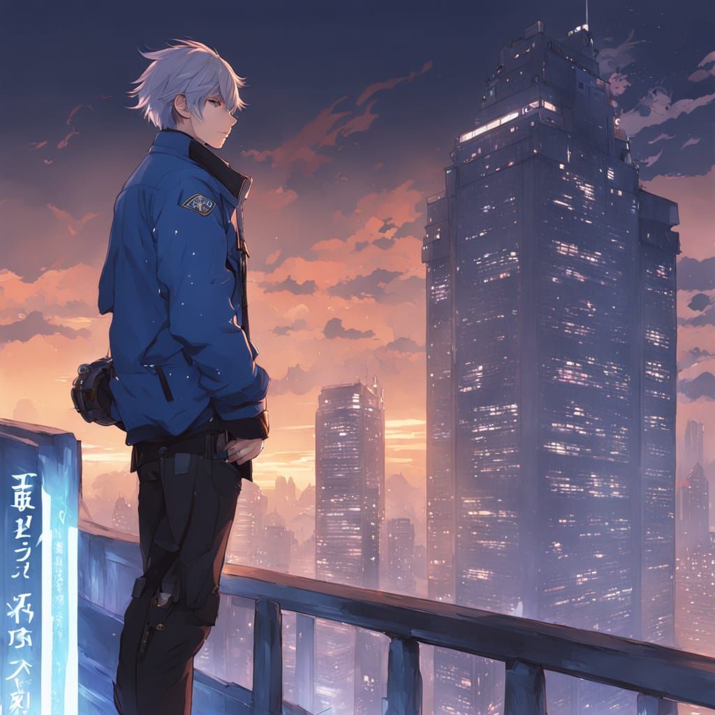 A vibrant anime-style image of a man in an FBI jacket standing on a rooftop. This concept art features a neon cityscape at dusk with glowing skyscrapers, rendered with soft gradient lighting.
