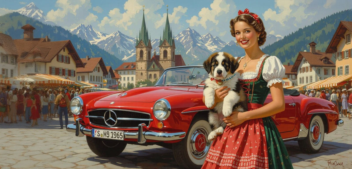 This oil painting captures a German Maid holding a Saint Bernard puppy, with a red Mercedes 190sl convertible. The romantic, impressionistic style features thick strokes and precise detail.