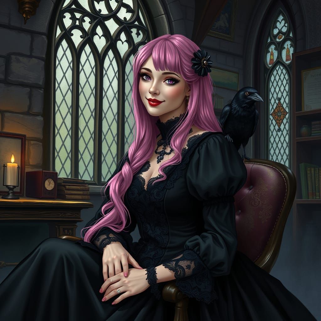 This image shows a pink-haired woman in a black gothic gown, smiling softly in a dimly lit office. A raven perches on her shoulder in this image rendered with intricate details and muted colors.