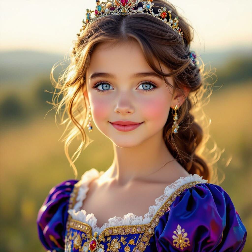 This image showcases a fair young princess with a sweet smile and striking blue eyes, adorned in a vibrant royal outfit. Bathed in soft, golden hour light, she stands against a picturesque landscape, depicted in a romantic oil painting style.