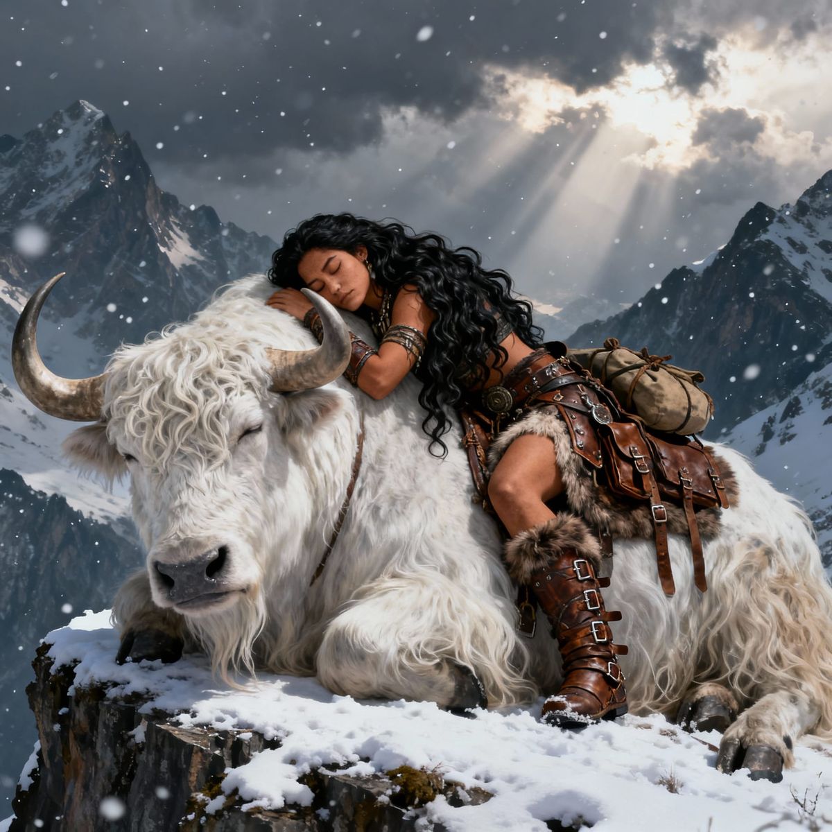 A hyperrealistic, cinematic fantasy image of a strong Hispanic warrior sleeping peacefully with her white war yak on a snowy mountain ledge. The scene features detailed armor, fur textures, and dramatic lighting.