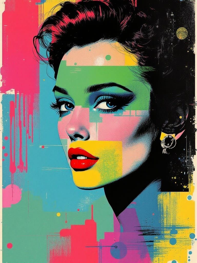 A classic pinup woman's image is distorted and amplified, blending the styles of Warhol and Munch with screen printing's graphic simplicity.