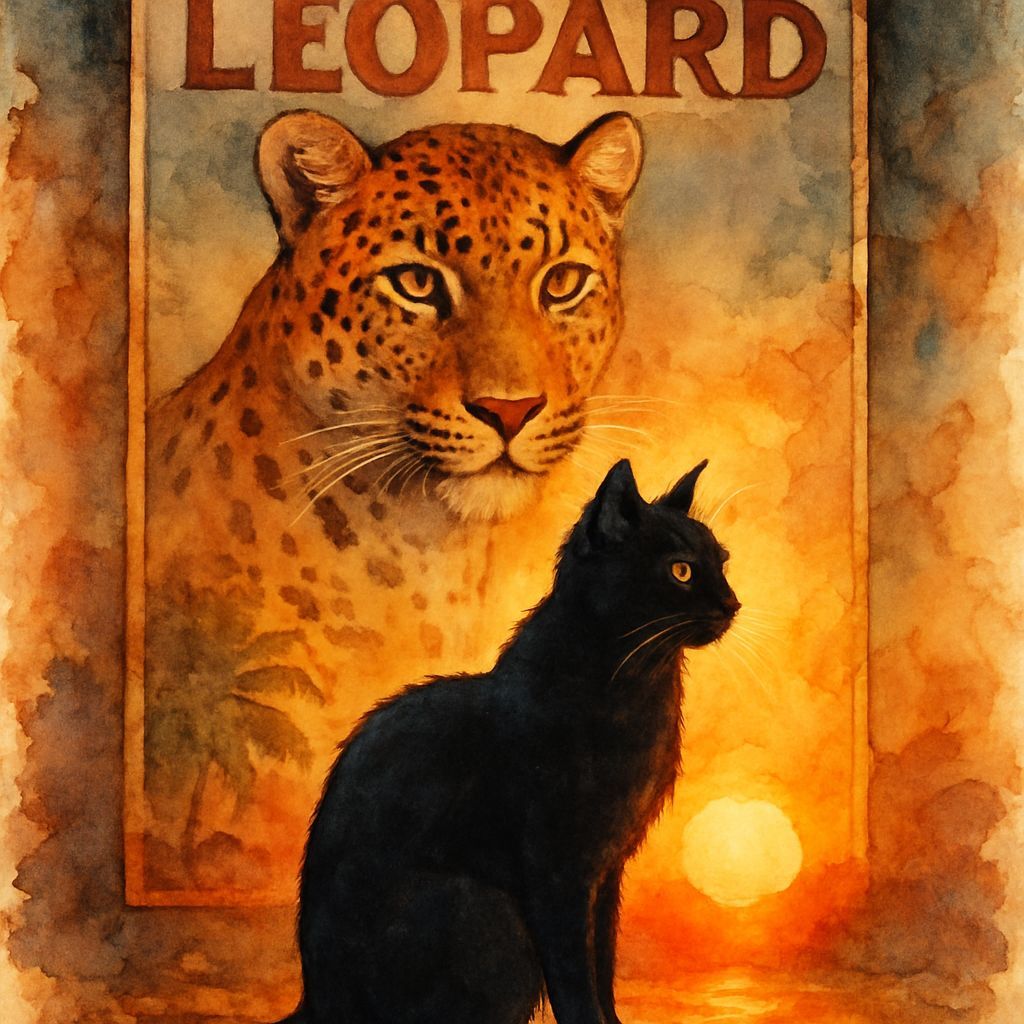 A cinematic image of a black cat silhouetted against a sunset. In the background is a vintage movie poster from the 1910s featuring a leopard, rendered as a watercolor painting.