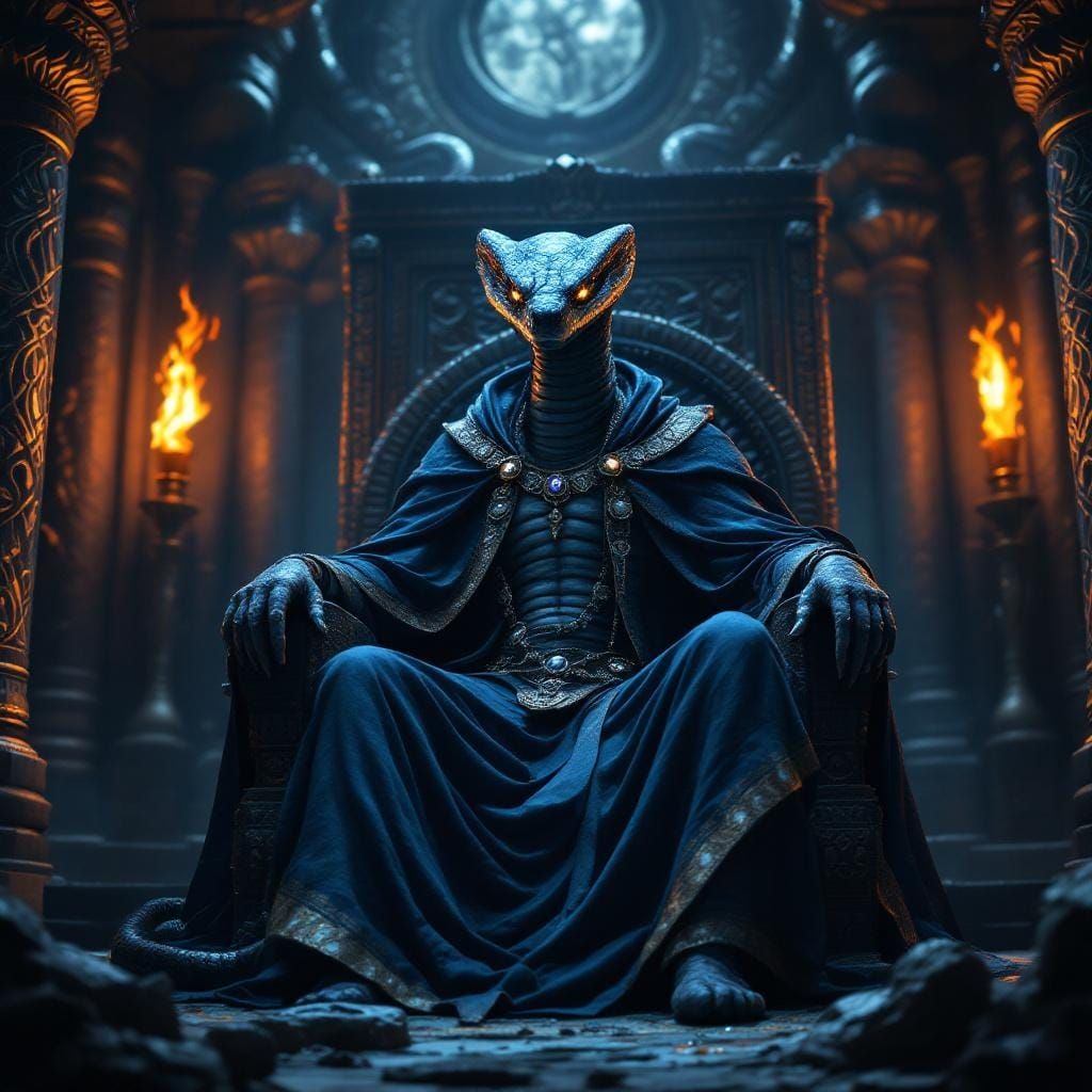 A majestic anthropomorphic cobra wearing royal garments sits on a throne. Flickering torchlight illuminates the hidden chamber, revealing intricate carvings. The image has a Renaissance painting aesthetic.