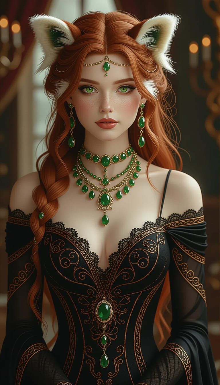 A striking full body view of an ethereal woman with red panda features, green eyes, and jade adornments, wearing a black and copper dress at a formal party, with cinematic and psychedelic artistic elements.