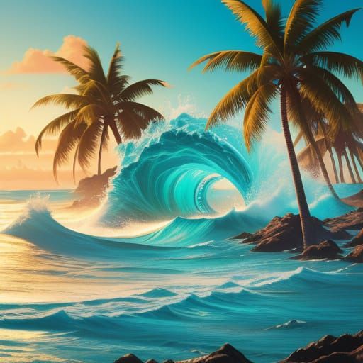 A vibrant oil painting of a tropical beach with glowing turquoise water. Golden light filters through the mist as palm trees sway in the breeze, rendered as detailed matte painting.