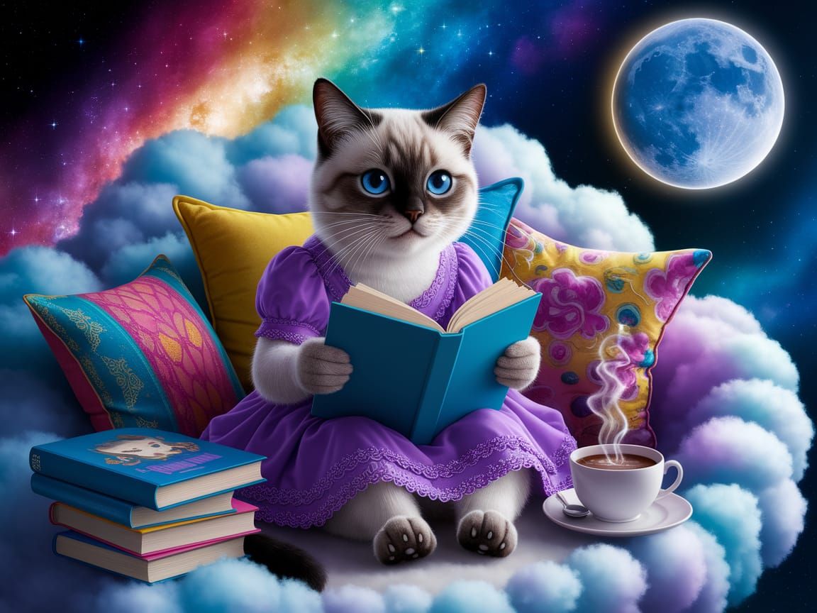 This image shows an anthropomorphic Siamese cat wearing a dress and reading on a cloud. Books, cushions, blankets, and hot cocoa surround her. The background features a colorful galaxy and full moon.