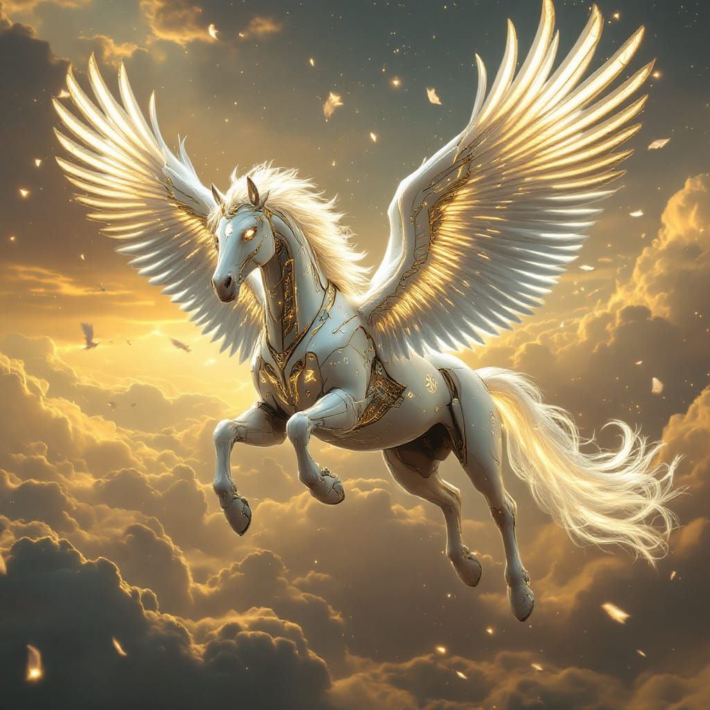 This image shows an angelic cybernetic Pegasus with a metallic body, luminous mane, and radiant wings, soaring through celestial golden clouds and shattered sky-temples with divine light.