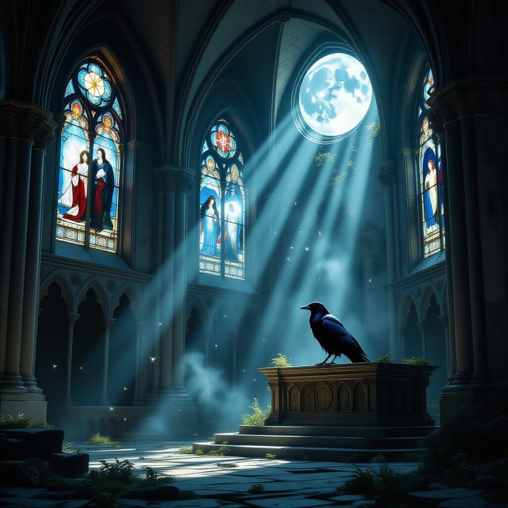 This photorealistic image captures a forgotten cathedral interior illuminated by moonlight through stained-glass windows. Dust motes dance in light beams, highlighting ancient carvings and a raven on an altar. Evokes lost high-fantasy.