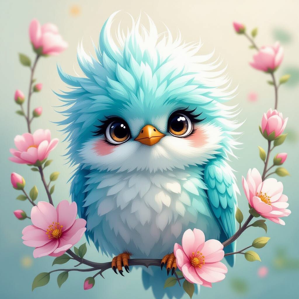 This image shows a cute, fluffy, pale turquoise bird with messy hair and expressive eyes, surrounded by delicate pink flowers. The artwork is rendered in a whimsical watercolor style.
