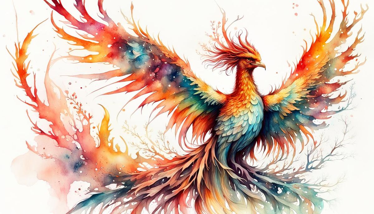 This image depicts a phoenix in a fantastical setting, rendered as a digital watercolor fairytale illustration. The artwork features intricate details, complex contrasts, and soft, cinematic lighting.
