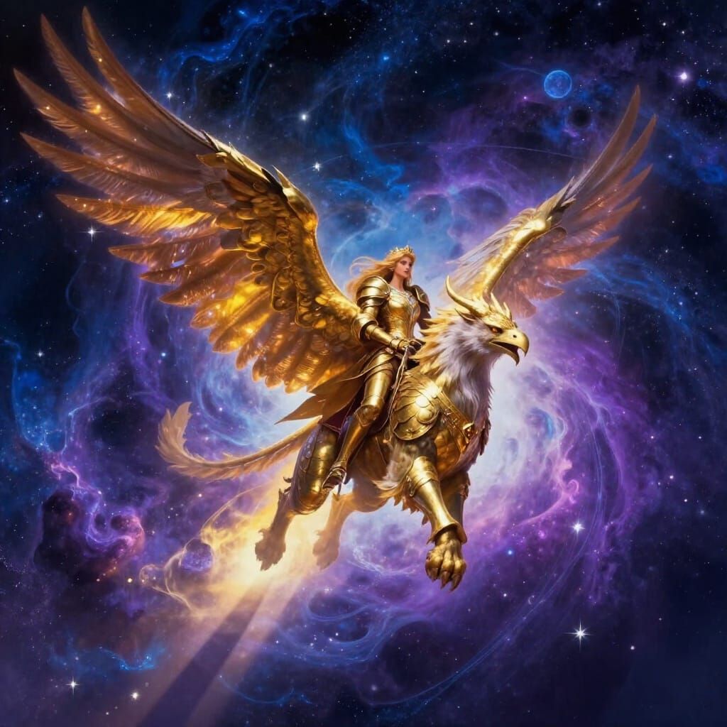 This image depicts Shera in golden armor riding a griffin through deep space. Swirling nebulae and distant stars are illuminated by a dying star, creating dramatic shadows in an epic fantasy concept art style.
