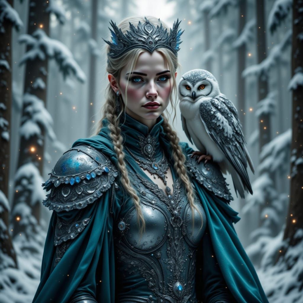 A striking image of a fair-skinned woman with blue eyes in detailed silver armor and a teal dress, standing in a snowy forest with a snowy owl. Rendered in a cinematic 3D style with luminescent particles.