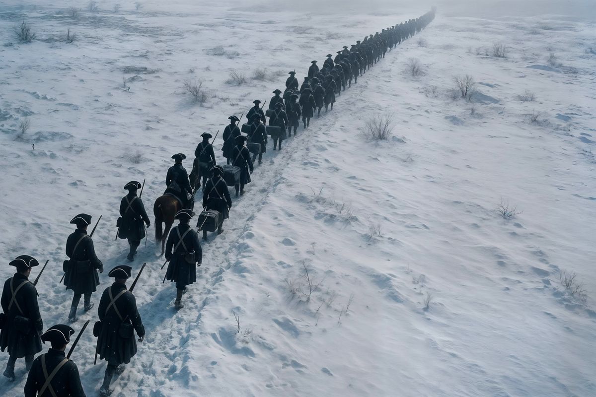 This image shows a high aerial view of Revolutionary War soldiers marching through a snowy winter landscape. They are wearing dark uniforms and hats, trekking across the desolate, frozen terrain in a muted color palette.