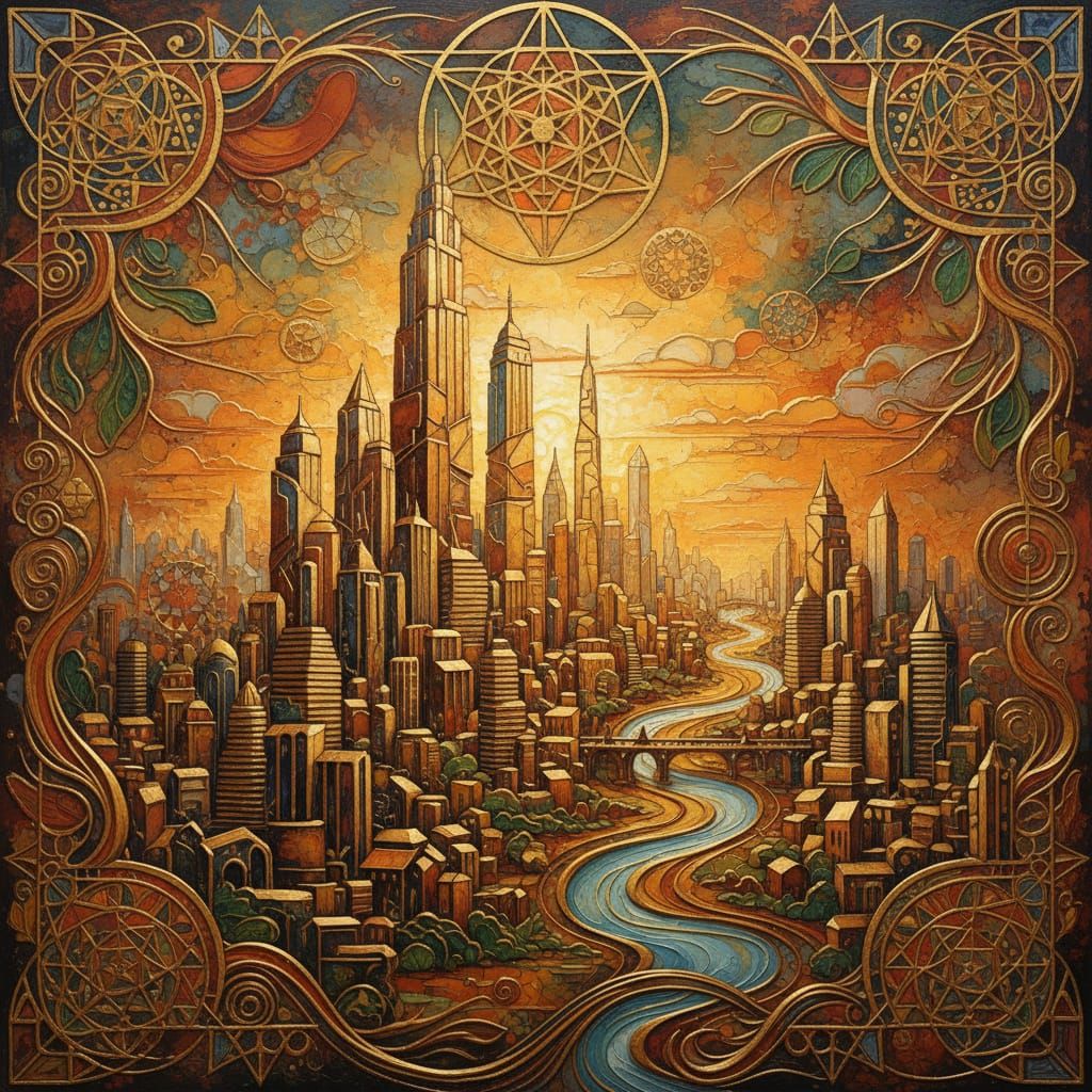 A kintsugi mosaic cityscape at sunset, medium shot, with thick, textured encaustic impasto and sensual lines, hues of ochre and bronze, warm golden light, and alcohol ink bleeding edges, blended with earthy tones, surrounded by intricate patterns of sacred geometry and organic shapes, reminiscent of Milo Manara, Georgy Kurasov, and Albert Gleizes, with expressive brushstrokes and vibrant, earthy tones, evoke nostalgia and surreal dreamlike quality.