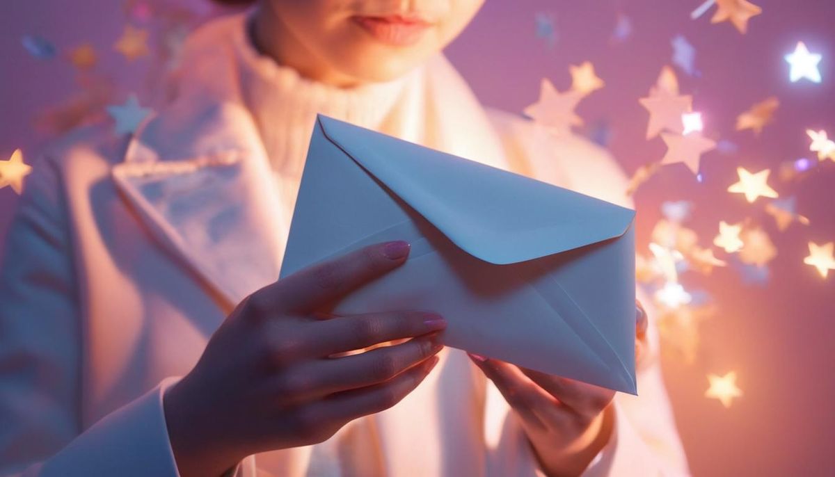 This image shows a surreal close-up portrait of a person holding an envelope. The artwork features melting details, double exposure, and glowing stars, rendered as 3D digital art with a soft pastel color palette.