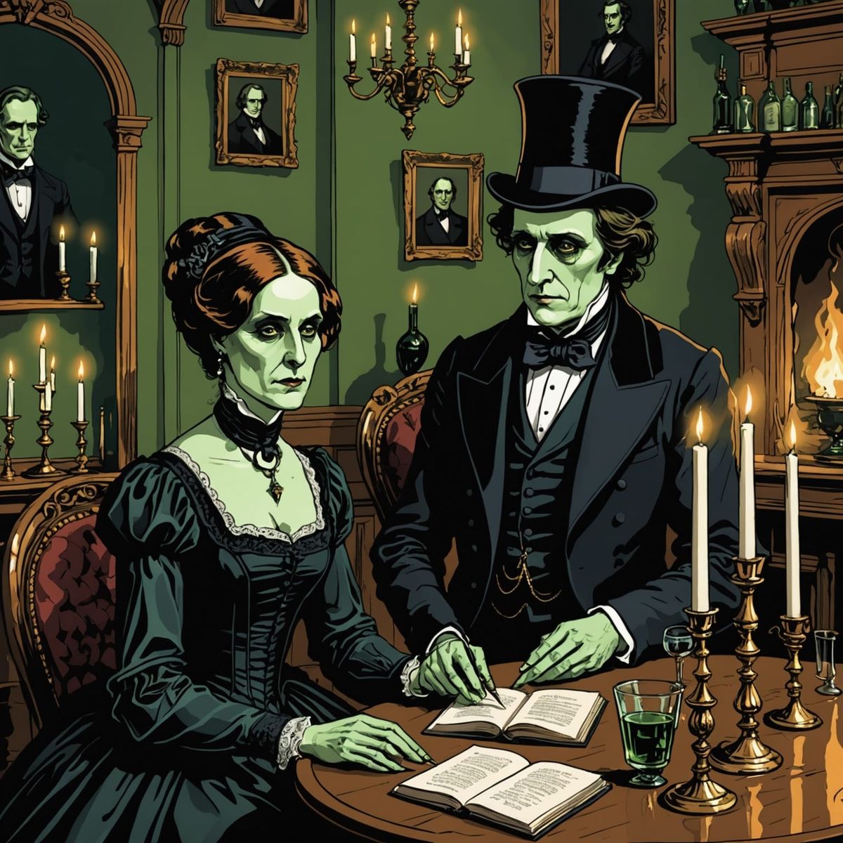 This image shows a haunted Victorian salon scene with ghosts and poltergeists causing mischief. The scene is reminiscent of baroque parties with floating tables and literary debaucheries.
