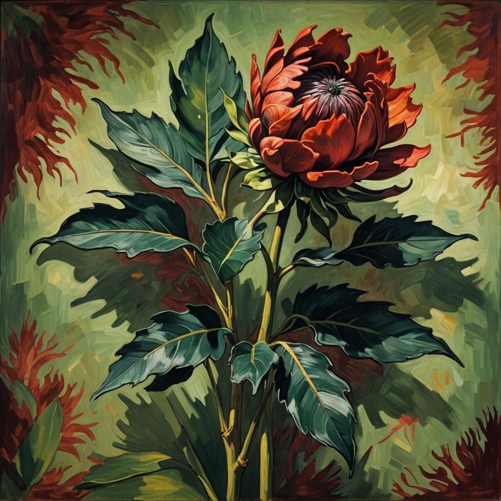 A vibrant Post-Impressionistic image of a single waratah flower. The bloom rests on velvet, illuminated by a dramatic spotlight. The shot features expressive brushstrokes and rich, deep colors.