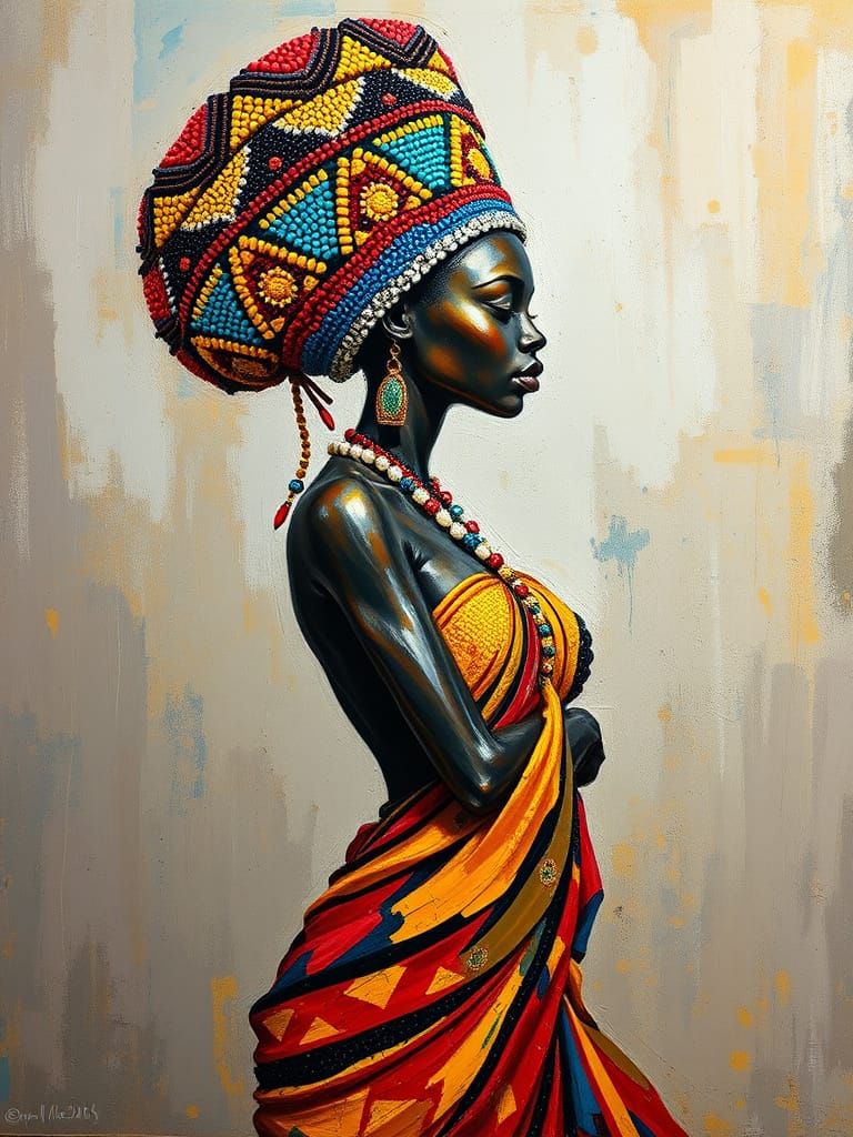 This image showcases a beautiful Zulu woman in traditional attire, wearing an intricately beaded headdress with geometric patterns in crimson, indigo, and sunflower yellow. The dynamic, abstract composition blends traditional Zulu beadwork with bold, expressive brushstrokes and vibrant colors, reminiscen...