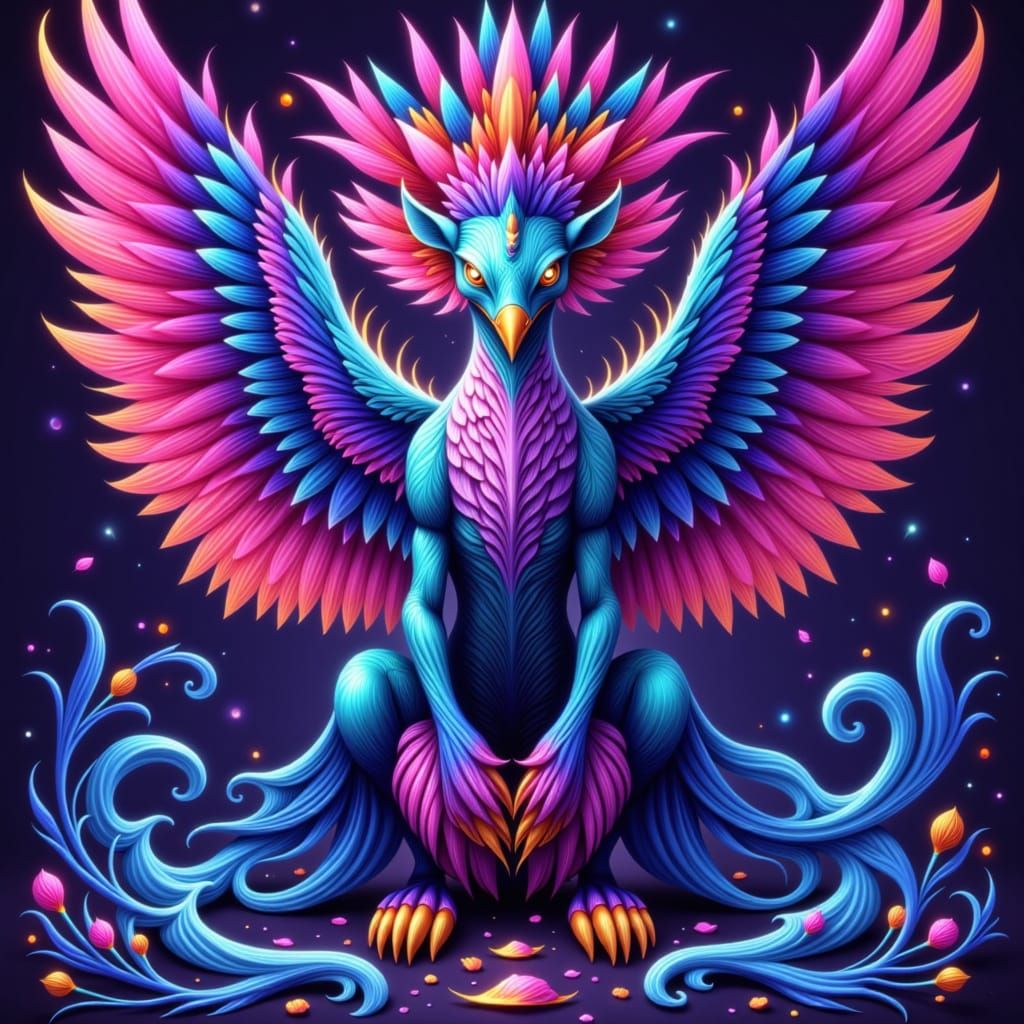 This digital illustration features a whimsical goth Quetzalcoatl with intricate, colorful feathers. The image bursts with playful colors and soft pastel gradients, accented with glowing details.