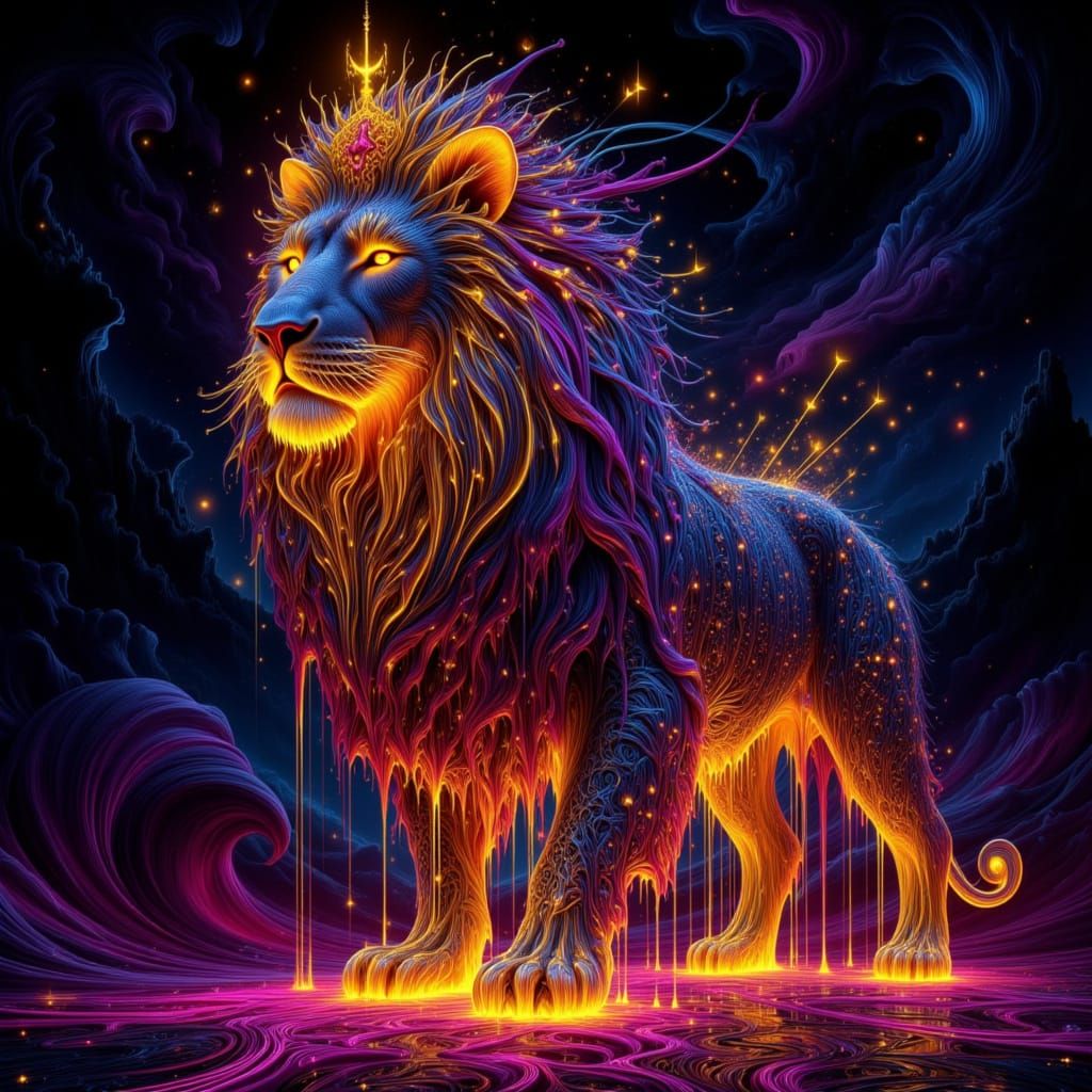 This image shows a majestic lion with a melting effect and neon accents, radiating a surreal aura. The artwork is rendered with hyperrealistic detail.